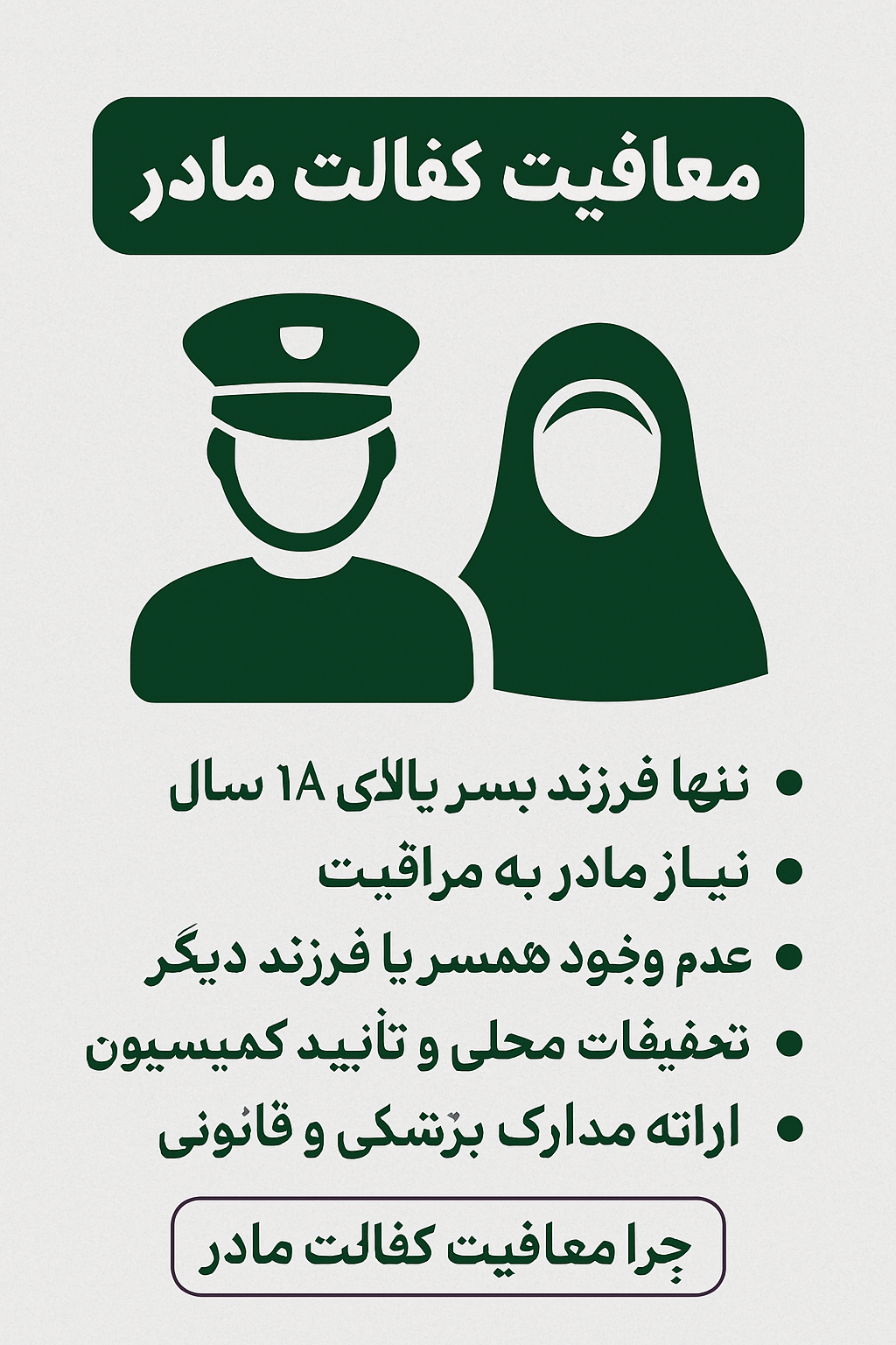 ✅ شرایط اصلی معافیت کفالت مادر تنها فرزند پسر بالای ۱۸ سال: مشمول باید تنها پسر خانواده باشد. نیاز مادر…